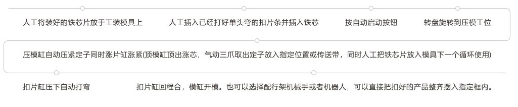 本机器是45T三工位电机定子扣片专用设备,适用于电机定子型号Y80-Y160